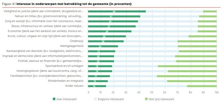 De interesse in lokaal nieuws is groot. 46 procent geeft aan buitengewoon of erg geïnteresseerd te zijn in wat er zich in hun gemeente afspeelt. Nog eens 43 procent is enigszins geïnteresseerd. Slechts een zeer klein deel van de burgers geeft aan helemaal niet (2 procent) of niet erg (9 procent) geïnteresseerd te zijn.