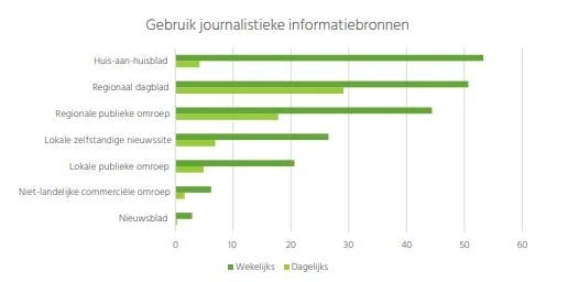 De manier waarop burgers zich informeren over lokaal nieuws verschilt duidelijk van de manier waarop men zich over nationaal en internationaal nieuws informeert. Op lokaal niveau wordt veel gebruik gemaakt van nieuwssites of -apps (inclusief verzamelsites) en papieren kranten, maar aanzienlijk minder van televisienieuws. Opmerkelijk is dat het (gratis) huis-aan-huisblad er beter in slaagt dan alle andere media om ook minder geïnteresseerden te bereiken. 20 procent van de niet erg of helemaal niet geïnteresseerden wordt wekelijks toch door informatie uit het huis-aan-huisblad bereikt. De lokale publieke omroep bereikt wekelijks meer dan 30 procent van de geïnteresseerden, maar slaagt er in mindere mate in de ongeïnteresseerden te bereiken (5 procent wekelijks).