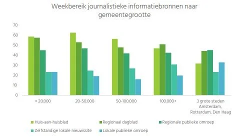 Wat tussen kleine en grote gemeenten ook verschilt, is het bereik dat alle lokale bronnen samen hebben. De regionale en lokale media in kleinere gemeenten bereiken een groter aandeel inwoners. Het zijn de van oorsprong papieren media die hiervoor verantwoordelijk zijn. Wat betreft de regionale publieke omroepen en de zelfstandige nieuwssites zijn er nauwelijks verschillen tussen kleinere en grotere gemeenten. De lokale publieke omroep doet het vooral in Amsterdam heel goed.