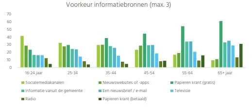 Kijken we samenvattend naar welke informatiebronnen een hoog bereik realiseren en ook meer dan gemiddeld hoog worden gewaardeerd, dan steken de regionale publieke omroepen (op televisie, maar ook online en op de radio) en het regionale dagblad op papier met hun nieuws over de gemeente boven de rest uit. De digitale kanalen van de informatiebronnen worden doorgaans minder positief gewaardeerd en vele hebben ook een relatief laag bereik.