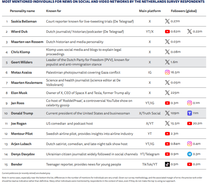 Wat opvalt is dat in Nederland, vergeleken met de 24 landen in het onderzoek, mensen weinig op hebben met newsfluencers. Er wordt relatief weinig content van individuele producenten geconsumeerd, en ook beleidsbepalers gaan er weinig op bezoek. In andere landen wordt het fenomeen een stuk serieuzer genomen. Politiek leiders als Macron (Frankrijk) en Starmer (V.K.) geven regelmatig interviews aan YouTubers en TikTokkers, Donald Trump zette tijdens zijn campagna vol in op podcasts en de moord op Charlie Kirk was wekenlang wereldnieuws.