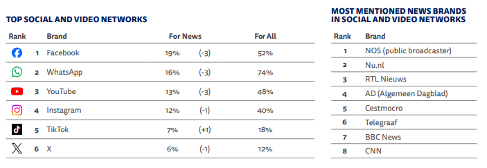 De tabellen zijn duidelijk. Nederlanders volgen voornamelijk de vertrouwde nieuwsmerken. De NOS, de grote kranten en een handvol gevestigde journalisten zijn de belangrijkste bronnen voor online nieuws. Het aantal gebruikers dat actief nieuws zoekt bij alternatieve of zelfstandige bronnen is klein, zeker in vergelijking met landen als de Verenigde Staten waar het nieuwslandschap al veel verder is versnipperd.