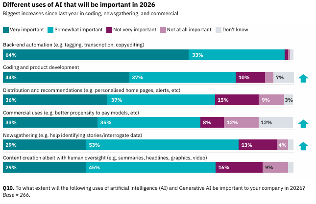 Hoewel AI breed wordt ingezet in nieuwsorganisaties – van transcriptie tot data‑analyse – noemen uitgevers de impact vooralsnog vooral “veelbelovend” of zelfs “beperkt”. Slechts een kleine minderheid ziet AI reeds als daadwerkelijk transformerend.