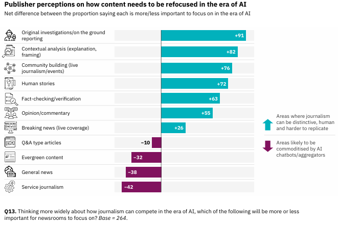 De omwenteling is duidelijk: uitgevers willen meer investeren in onderzoek, duiding, menselijke verhalen en fact-checking. Er valt weinig meer te verdienen met generieke updates of service/evergreen content die AI makkelijk kan overnemen